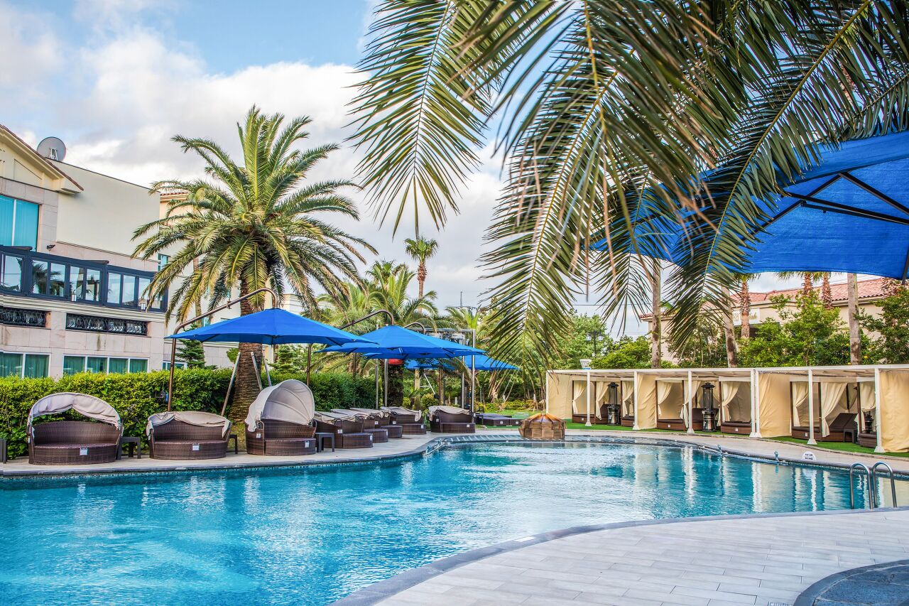 자쿠지에서 시간을 보내는 것 못지않게 야외 수영장의 온도를 따뜻하게 조절해 두어 겨울에 가도 따뜻한 물에서 시간을 보낼 수 있습니다. 온수풀 옆에는 선베드와 카바나가 마련되어 있으며 히노끼 사우나를 즐기기에도 좋아요.